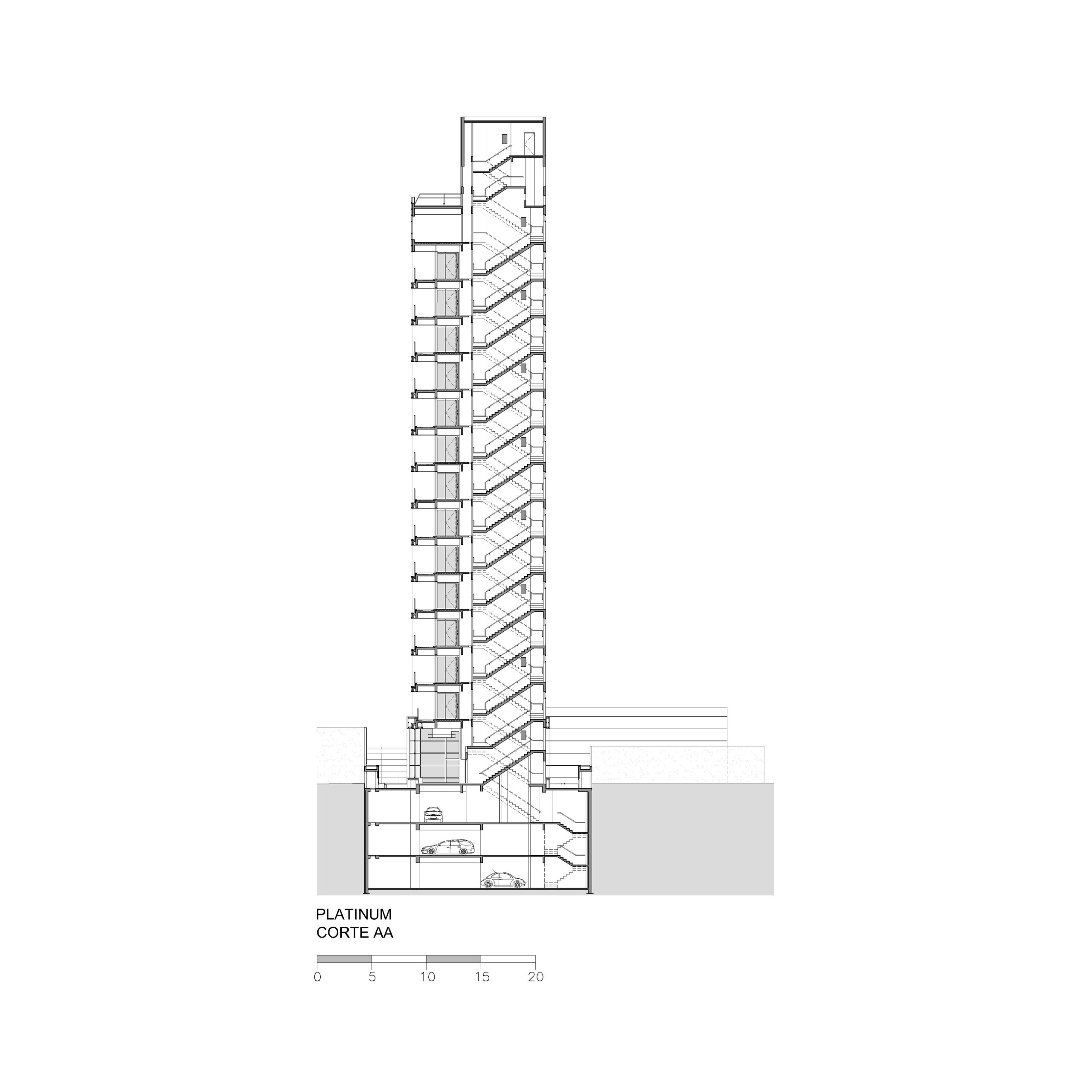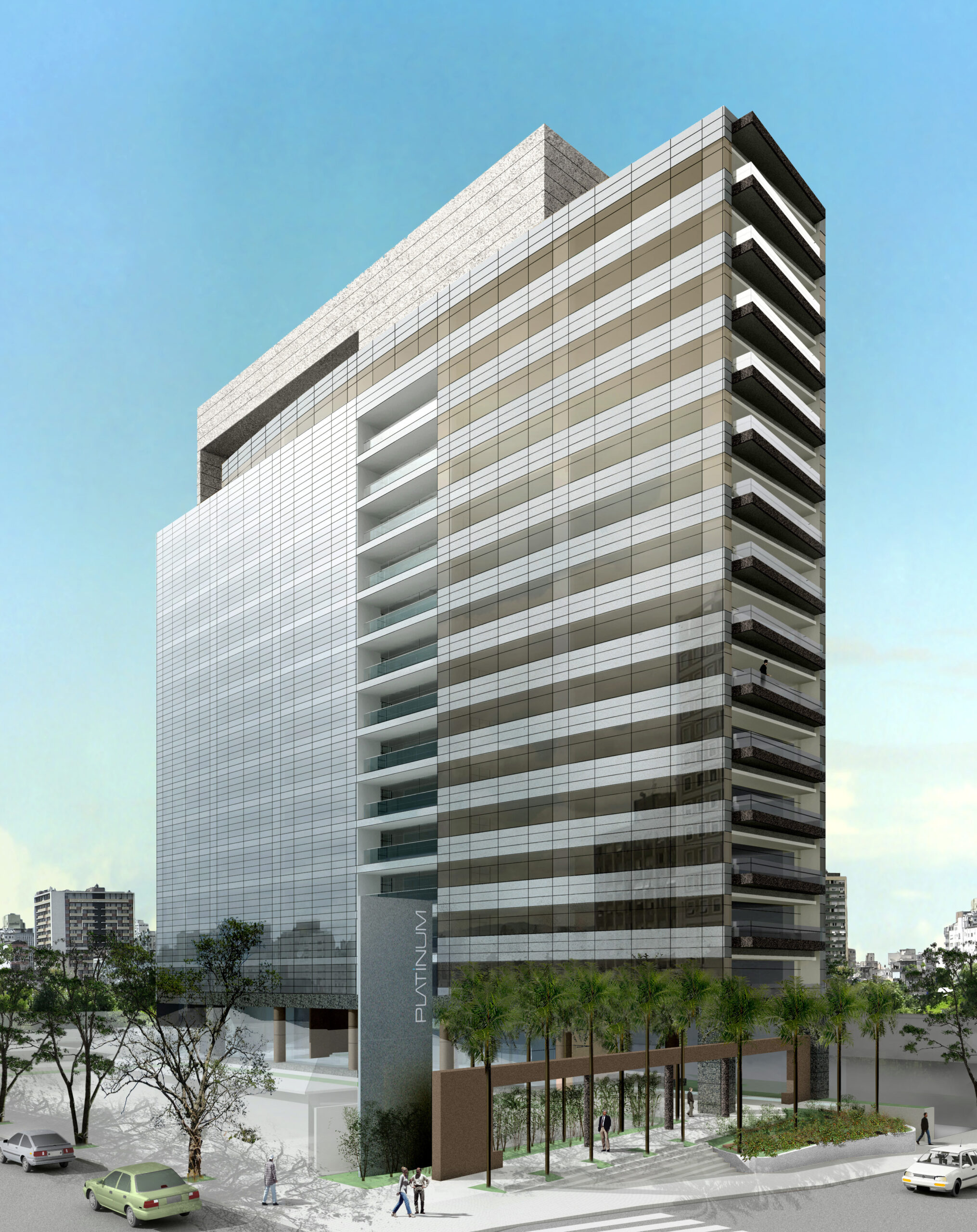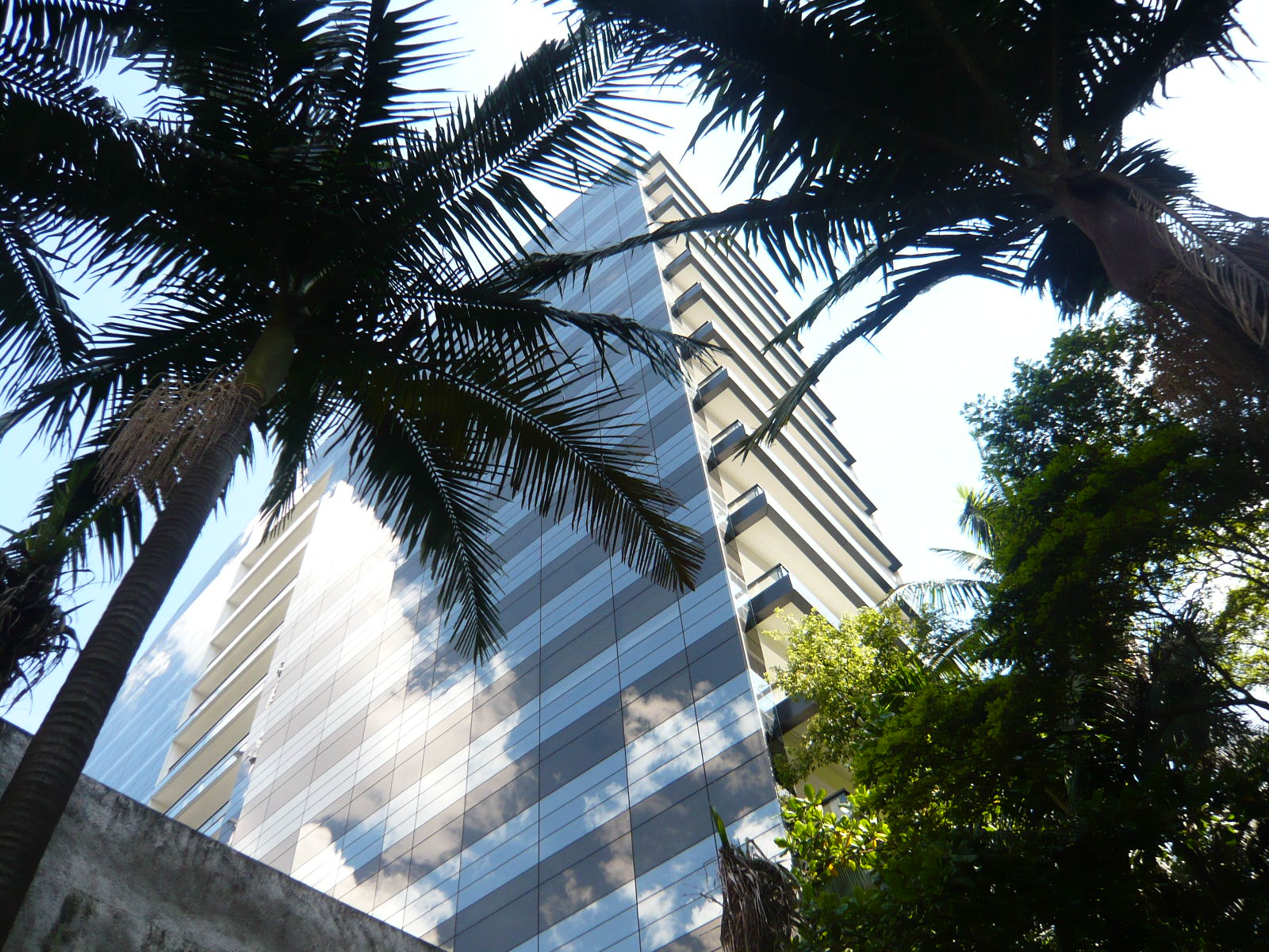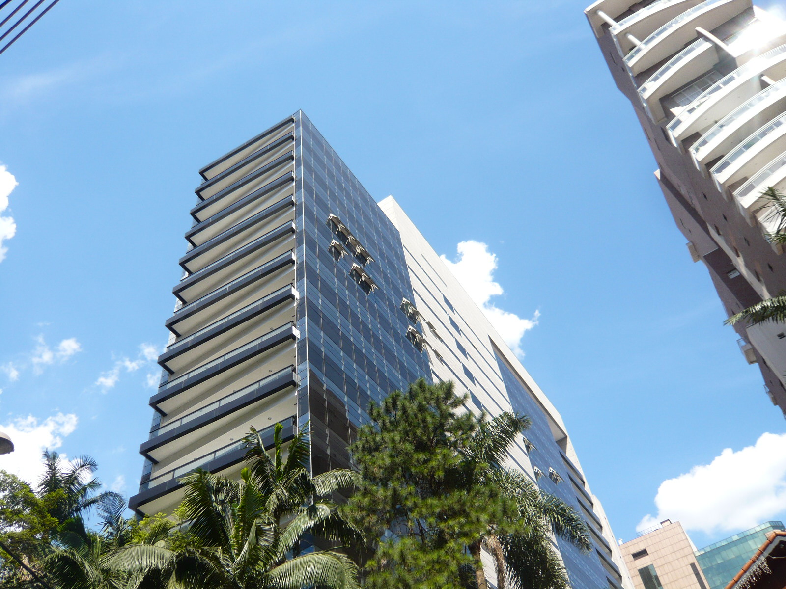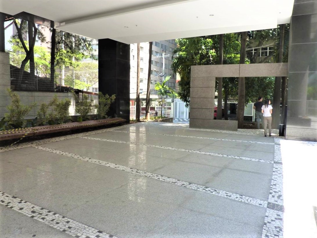 Depois de vários estudos de implantação que incorporavam várias lojas voltadas para a Alameda Santos, o incorporador não conseguiu convencer os proprietários a venderem seus lotes e a torre ficou presa a uma forma mais linear. Mesmo assim solução de projeto encontrada pelo Felipe Aflalo garante a presença do edifício na Alameda Santos. A fachada curva e envidraçada voltada para a Alameda Santos dá uma leitura muito boa do volume do prédio e sua modernidade. O pequeno lote da esquina que foi adquirido permitiu um acesso de pedestres também pela esquina. O projeto de arquitetura relocou as inúmeras arvores do terreno original, permitindo um manejo arbóreo bem-sucedido. O desenho do lobby do térreo trouxe novos elementos plásticos e se transformou num espaço de foyer para o pequeno teatro ali situado. Tivemos um desenvolvimento cuidadoso da arquitetura e de todos os projetos que coordenamos.