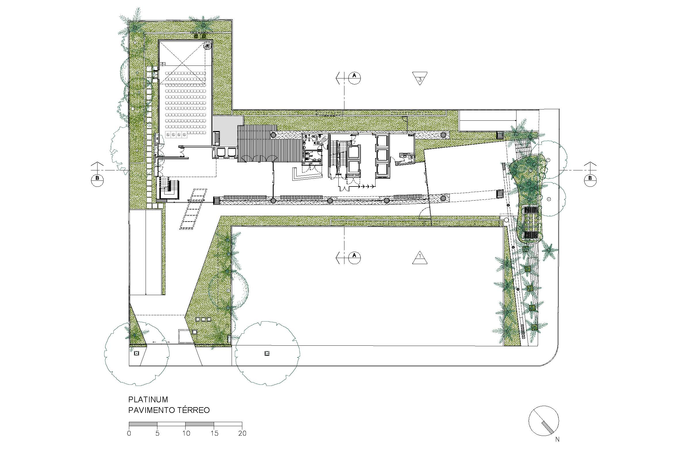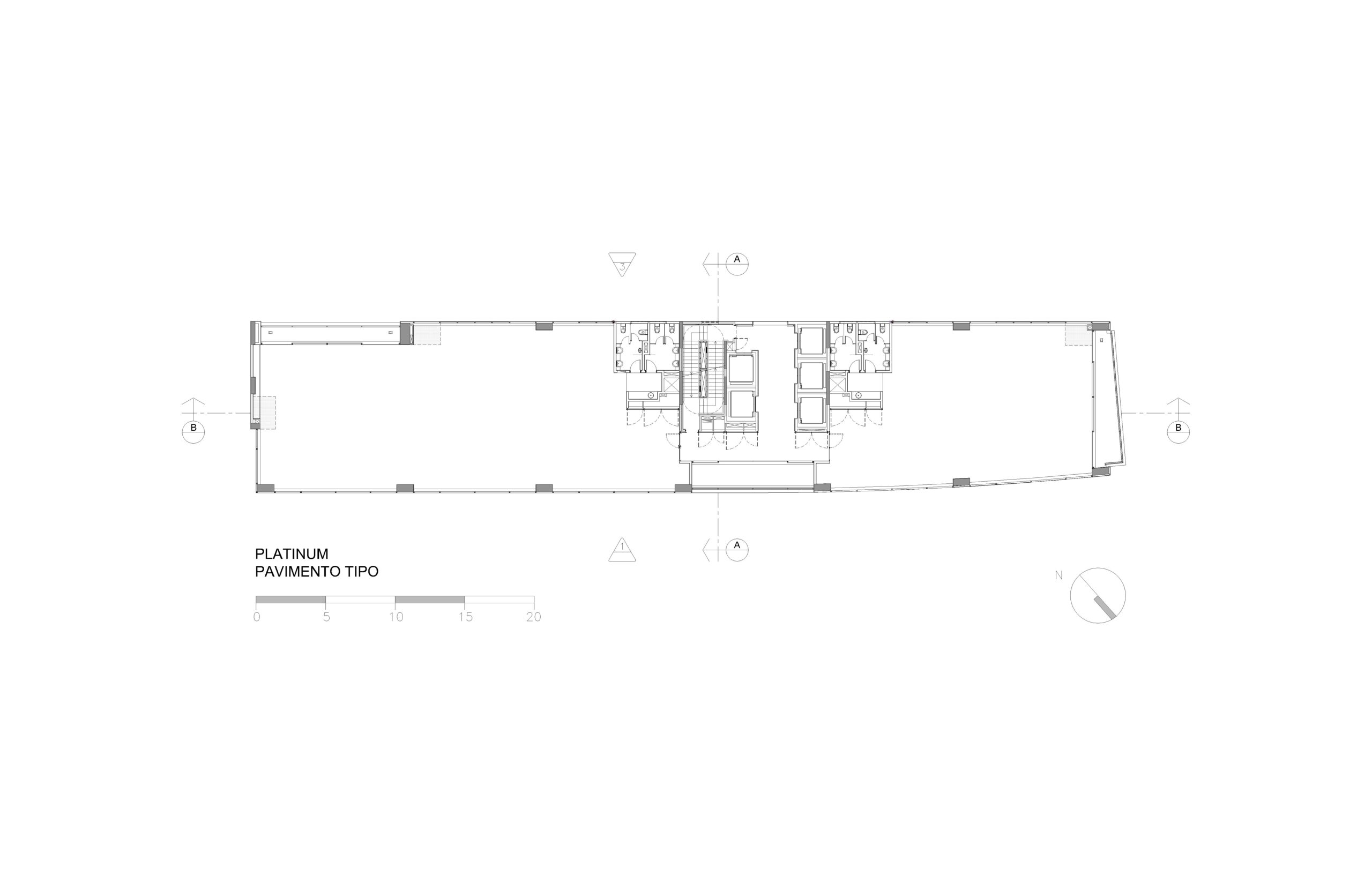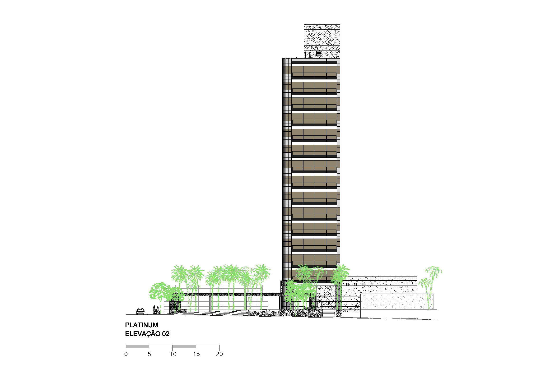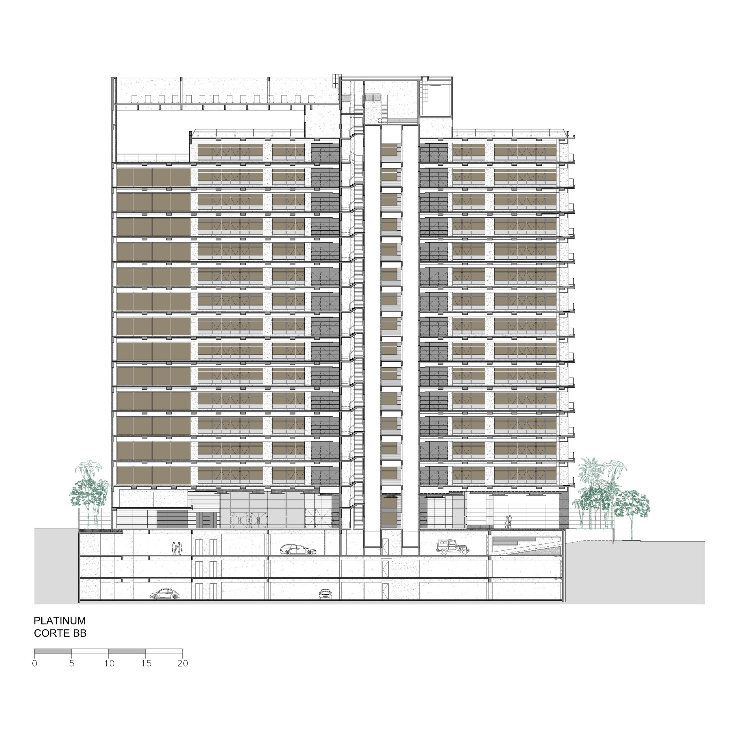 Depois de vários estudos de implantação que incorporavam várias lojas voltadas para a Alameda Santos, o incorporador não conseguiu convencer os proprietários a venderem seus lotes e a torre ficou presa a uma forma mais linear. Mesmo assim solução de projeto encontrada pelo Felipe Aflalo garante a presença do edifício na Alameda Santos. A fachada curva e envidraçada voltada para a Alameda Santos dá uma leitura muito boa do volume do prédio e sua modernidade. O pequeno lote da esquina que foi adquirido permitiu um acesso de pedestres também pela esquina. O projeto de arquitetura relocou as inúmeras arvores do terreno original, permitindo um manejo arbóreo bem-sucedido. O desenho do lobby do térreo trouxe novos elementos plásticos e se transformou num espaço de foyer para o pequeno teatro ali situado. Tivemos um desenvolvimento cuidadoso da arquitetura e de todos os projetos que coordenamos.