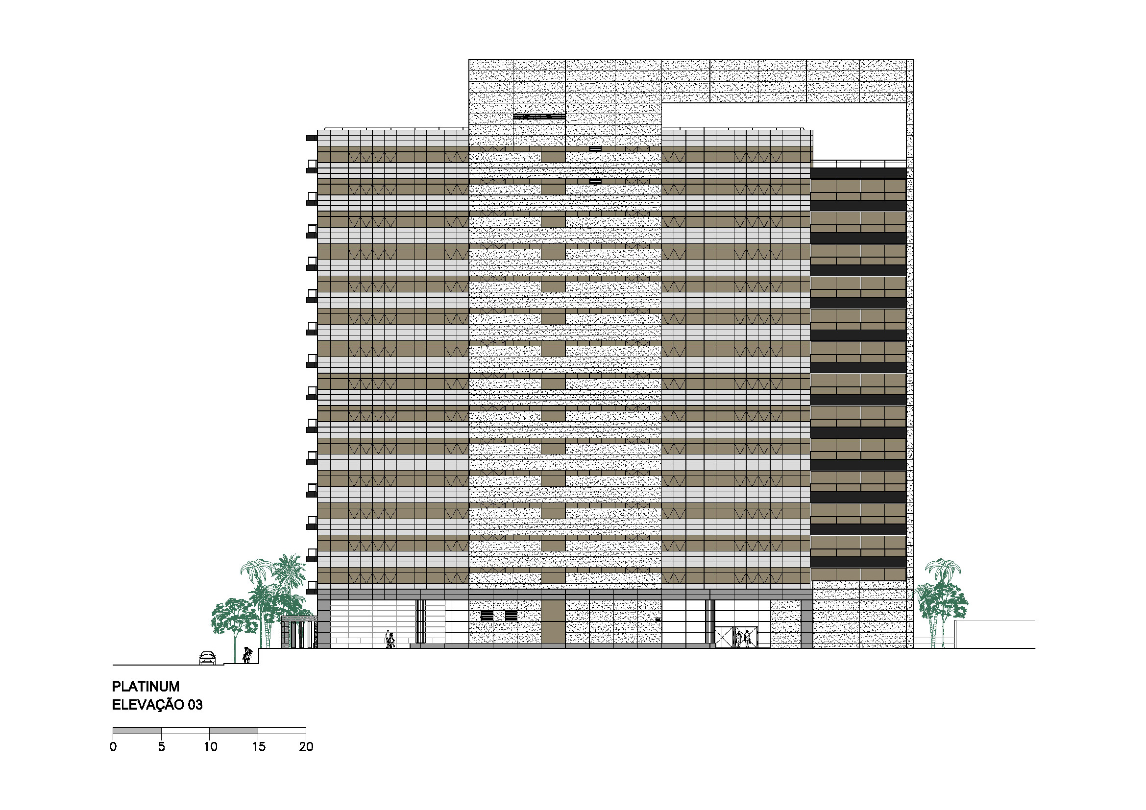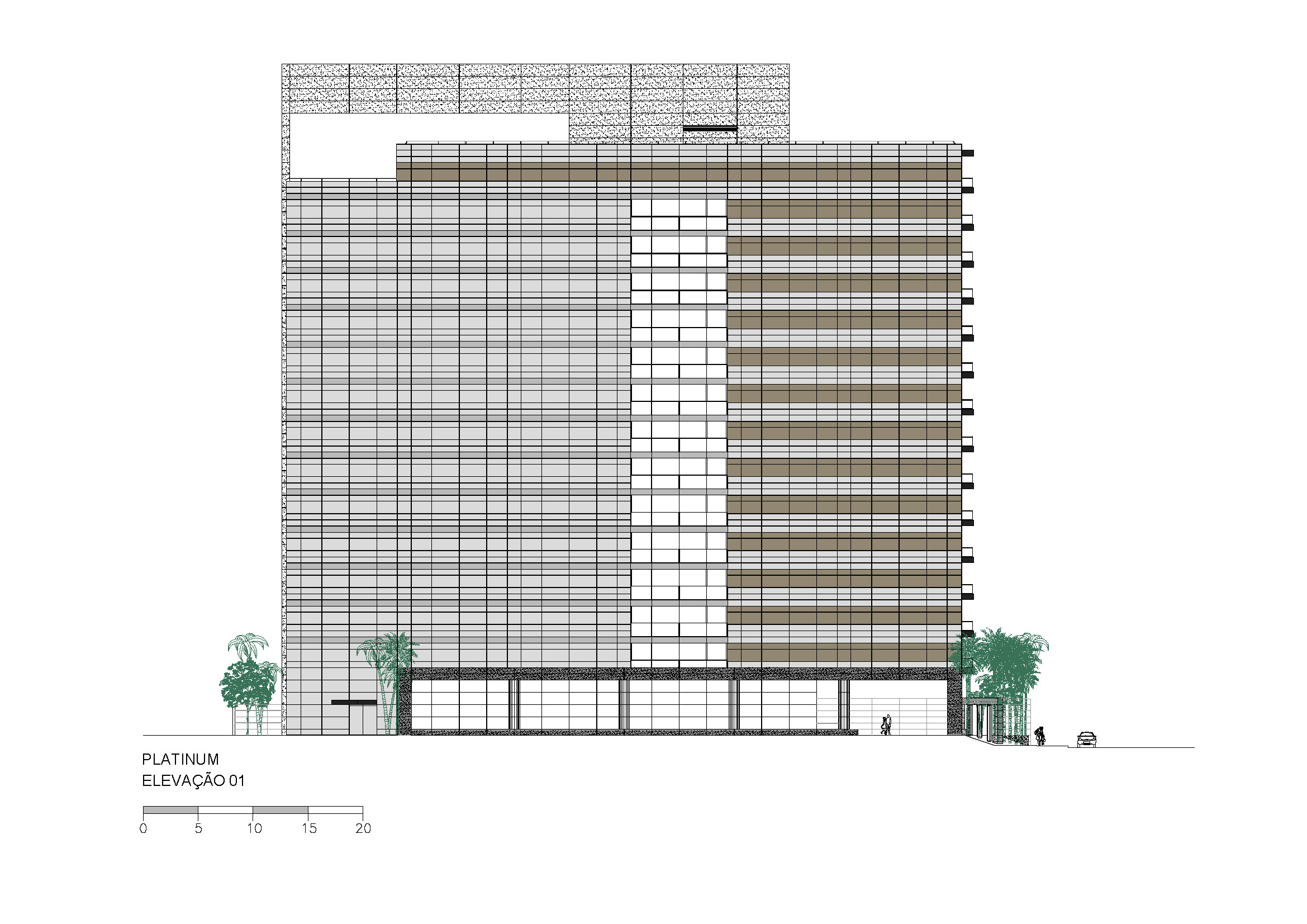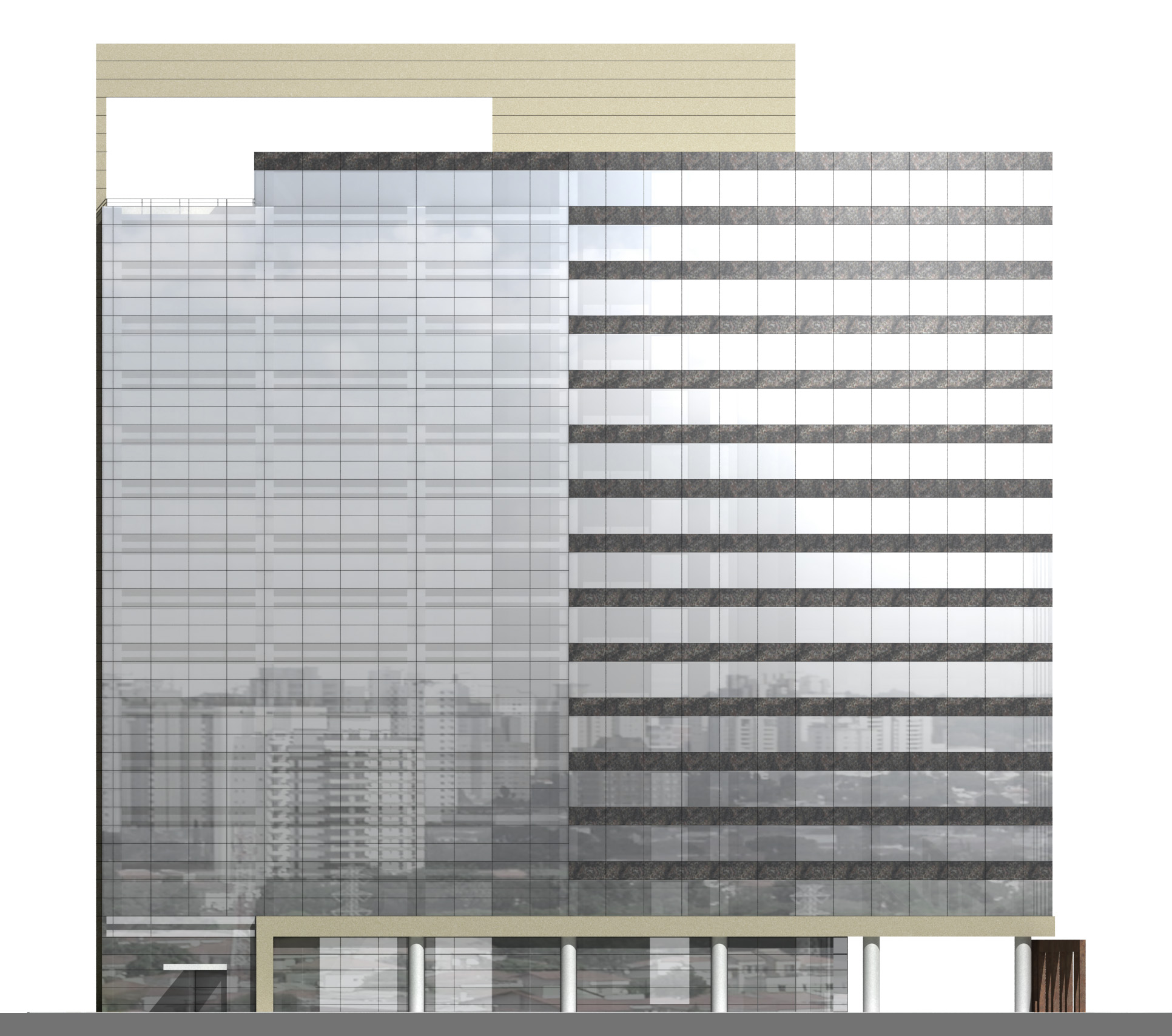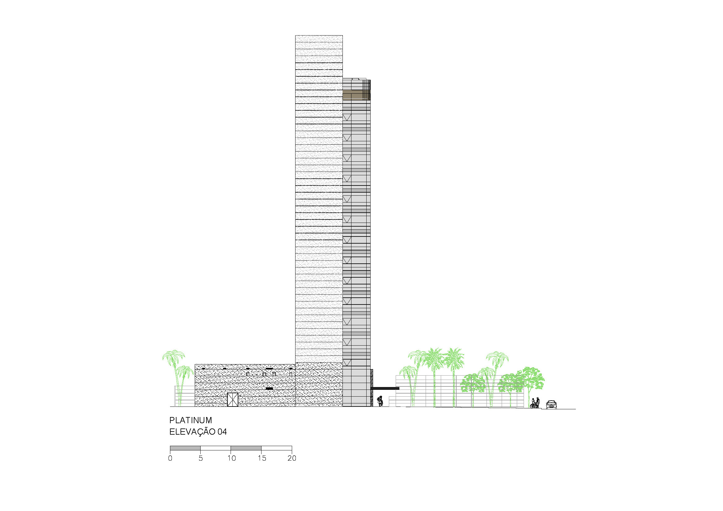 Depois de vários estudos de implantação que incorporavam várias lojas voltadas para a Alameda Santos, o incorporador não conseguiu convencer os proprietários a venderem seus lotes e a torre ficou presa a uma forma mais linear. Mesmo assim solução de projeto encontrada pelo Felipe Aflalo garante a presença do edifício na Alameda Santos. A fachada curva e envidraçada voltada para a Alameda Santos dá uma leitura muito boa do volume do prédio e sua modernidade. O pequeno lote da esquina que foi adquirido permitiu um acesso de pedestres também pela esquina. O projeto de arquitetura relocou as inúmeras arvores do terreno original, permitindo um manejo arbóreo bem-sucedido. O desenho do lobby do térreo trouxe novos elementos plásticos e se transformou num espaço de foyer para o pequeno teatro ali situado. Tivemos um desenvolvimento cuidadoso da arquitetura e de todos os projetos que coordenamos.