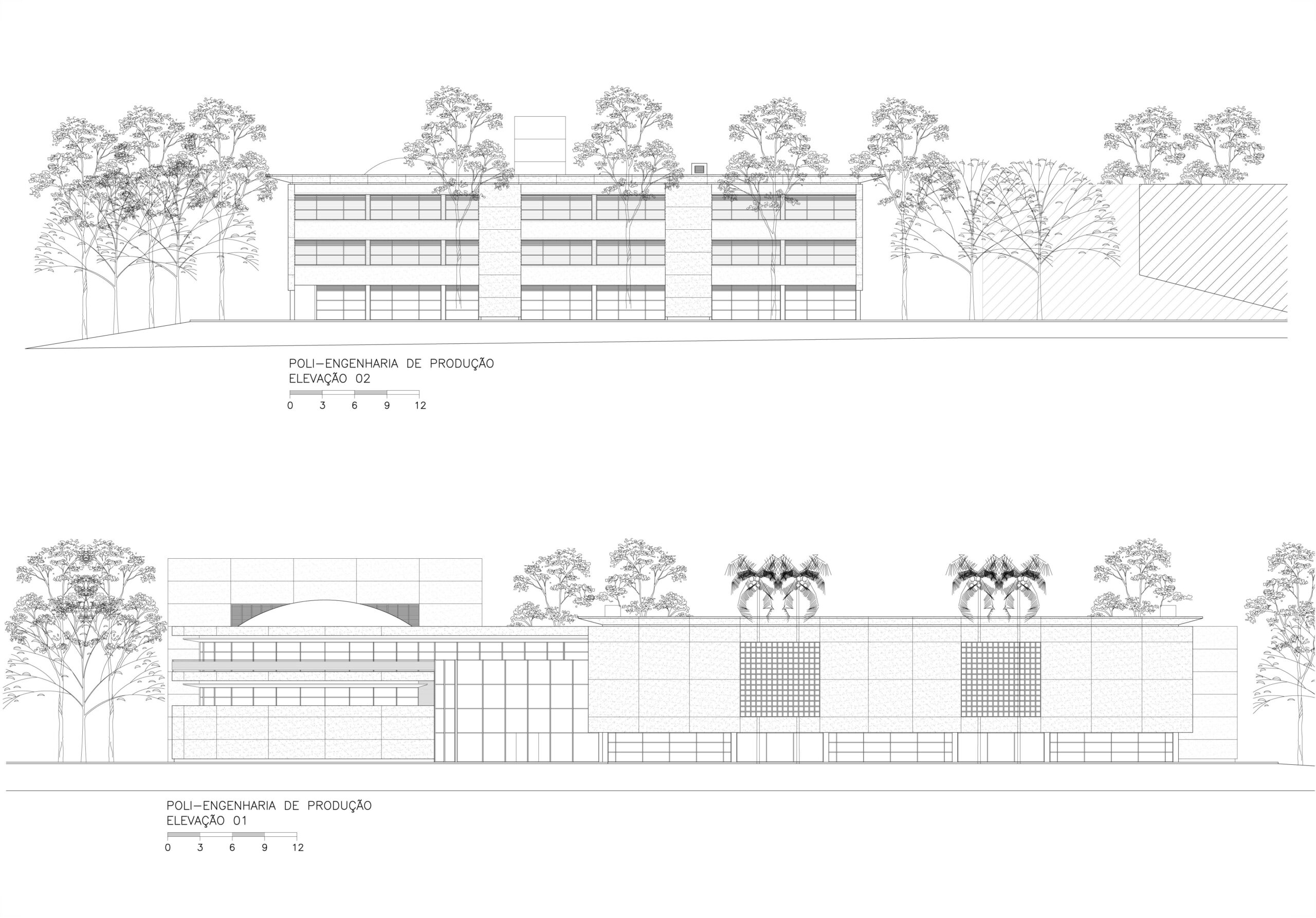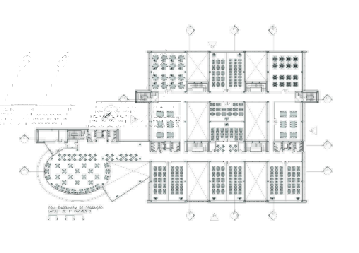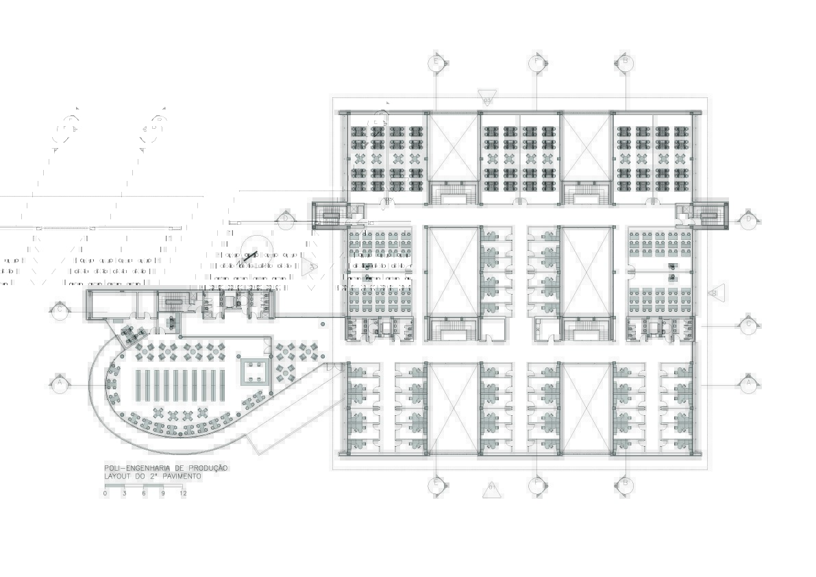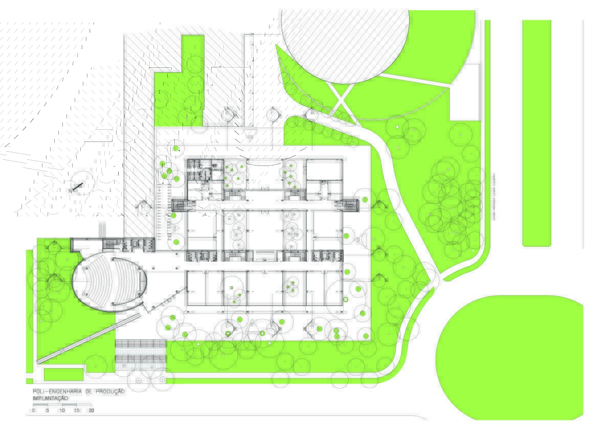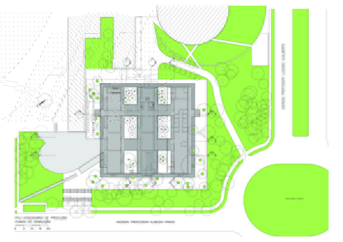 Fomos contratados pelo Itaú para fazer o projeto de reforma e ampliação da escola de engenharia de produção da USP, instalada em três galpões térreos e espalhada por outros edifícios. A solicitação foi para reunir todos seus departamentos em um único conjunto, aproveitando o existente. Após análise criteriosa do local e do funcionamento da escola, projetamos um segundo andar em construções com estruturas independentes a serem vestidas por sobre os três galpões existentes. Isto permite uma logística de obra que atende a demanda de preservação do existente. Ao final, esta solução engloba os três galpões e seus dois pátios internos preservados, formando um único e moderno conjunto. A demanda incluía a construção de um auditório e uma biblioteca, que foram projetadas em um novo bloco com formas arredondadas, que valorizam as novas instalações e situado de maneira a ter um acesso diretamente da escola e outro mais generoso, voltado para a avenida professor Almeida Prado, marcando assim a identidade da escola, sem descaracterizar a integração com os tradicionais edifícios da escola Politécnica.