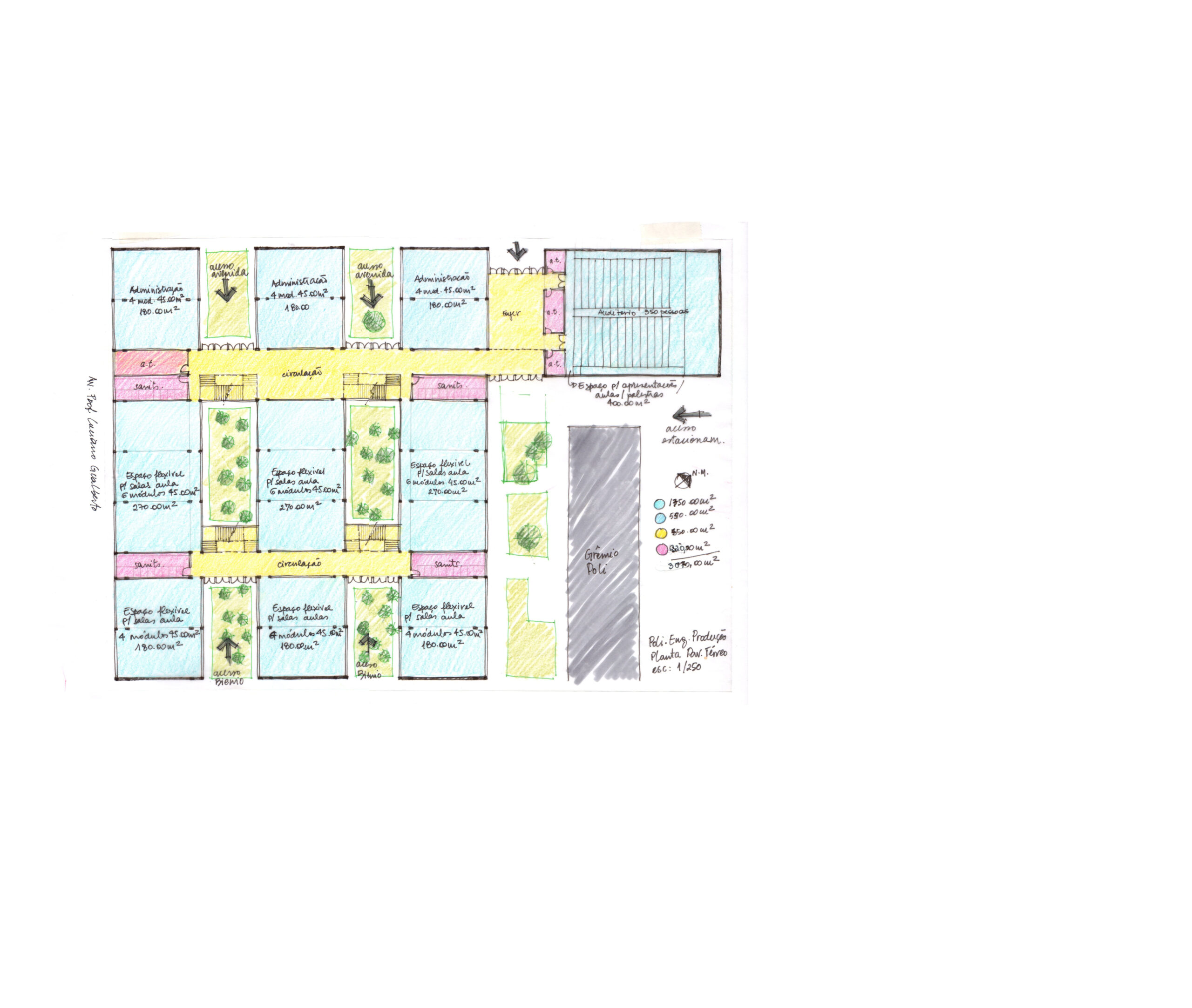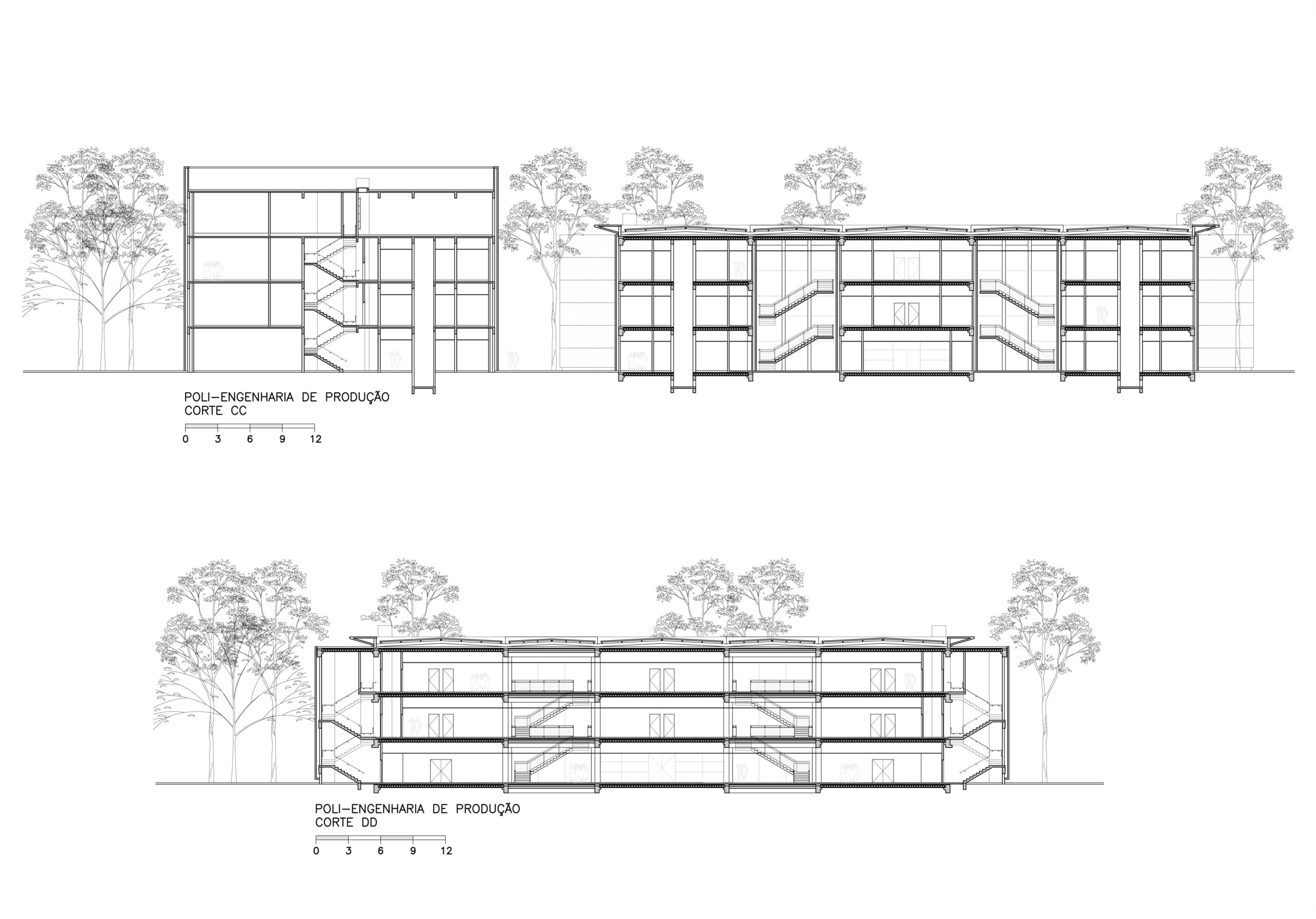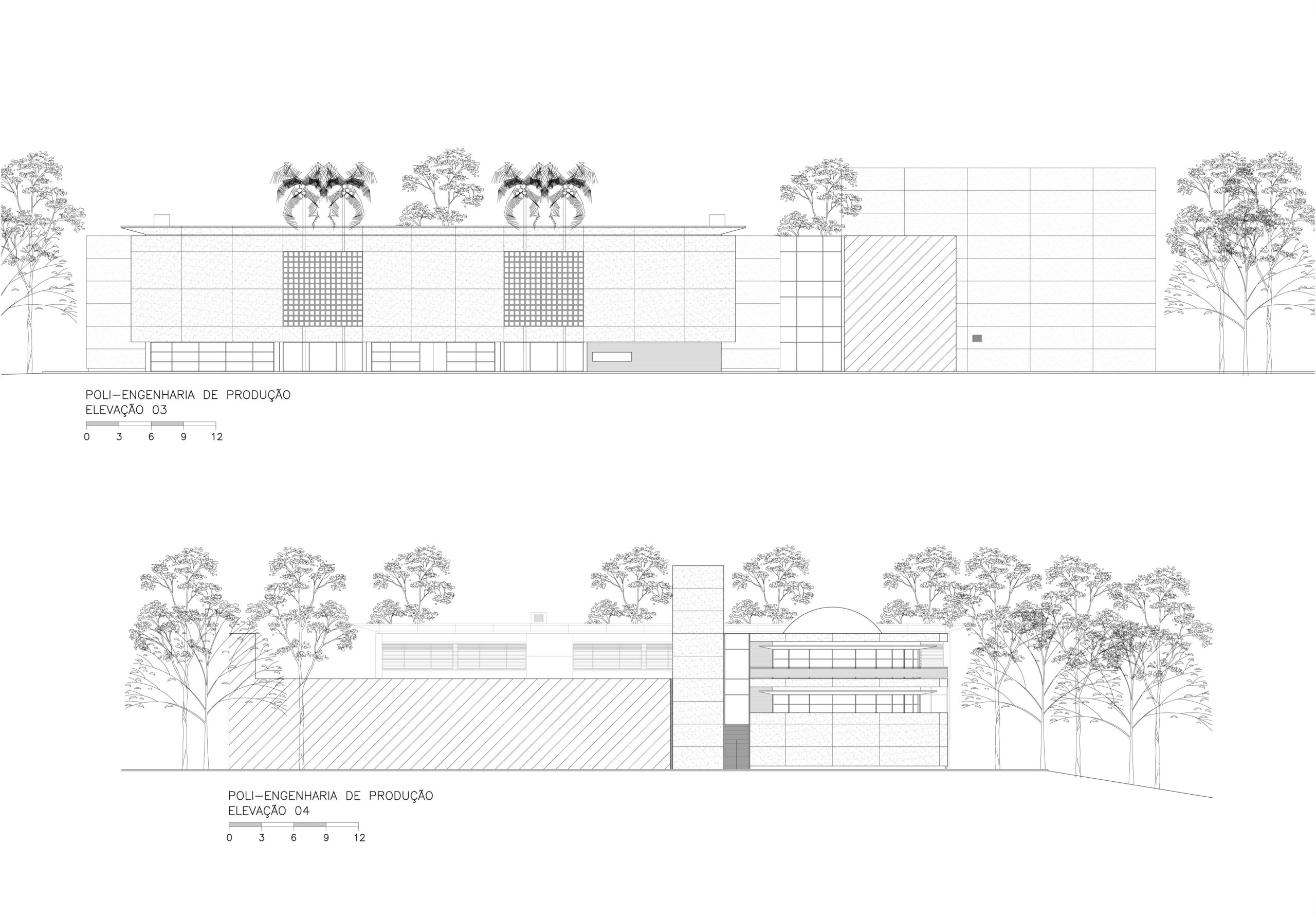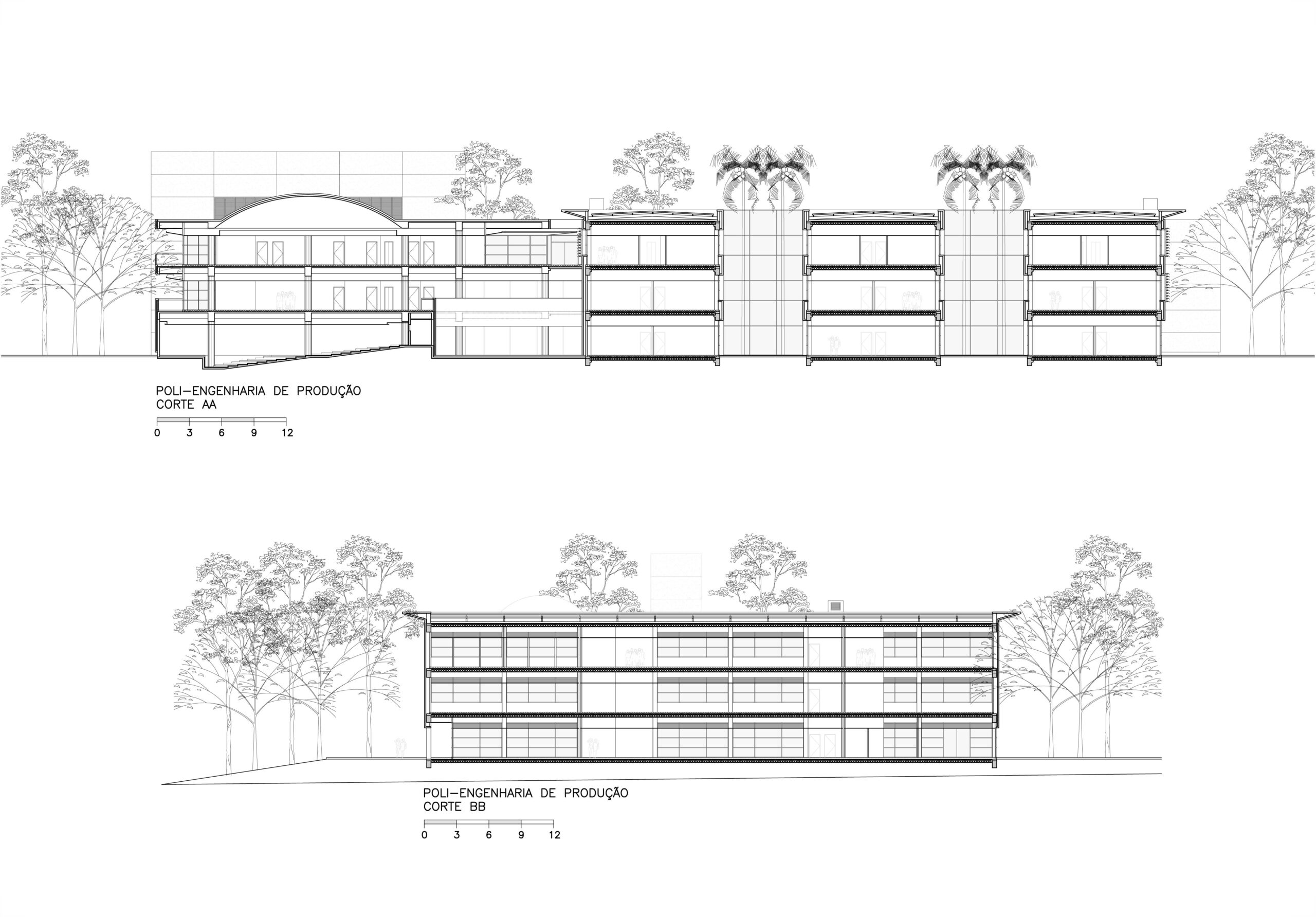 Fomos contratados pelo Itaú para fazer o projeto de reforma e ampliação da escola de engenharia de produção da USP, instalada em três galpões térreos e espalhada por outros edifícios. A solicitação foi para reunir todos seus departamentos em um único conjunto, aproveitando o existente. Após análise criteriosa do local e do funcionamento da escola, projetamos um segundo andar em construções com estruturas independentes a serem vestidas por sobre os três galpões existentes. Isto permite uma logística de obra que atende a demanda de preservação do existente. Ao final, esta solução engloba os três galpões e seus dois pátios internos preservados, formando um único e moderno conjunto. A demanda incluía a construção de um auditório e uma biblioteca, que foram projetadas em um novo bloco com formas arredondadas, que valorizam as novas instalações e situado de maneira a ter um acesso diretamente da escola e outro mais generoso, voltado para a avenida professor Almeida Prado, marcando assim a identidade da escola, sem descaracterizar a integração com os tradicionais edifícios da escola Politécnica.