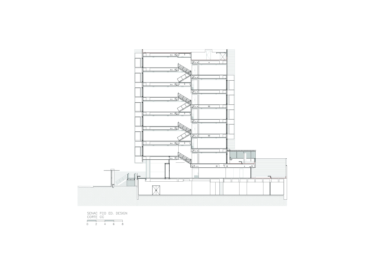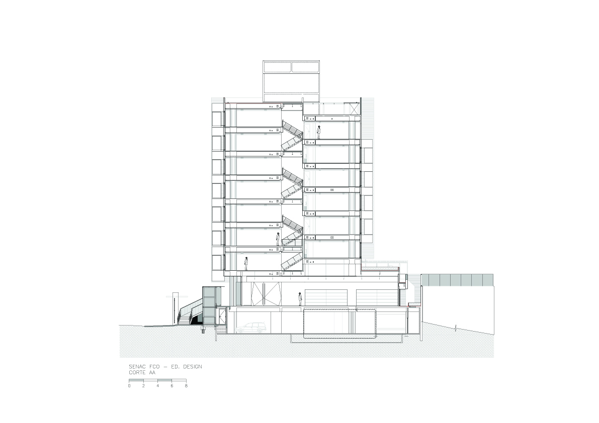 Esta unidade do Senac foi construída na década de 1970, a partir de projeto do arquiteto Sergio Pileggi. Esta escola vertical está dividida em dois blocos em, meio pisos, separados por escadas que atendiam todos os níveis. O Senac solicitou uma reforma para instalação de um centro/escola de DESIGN, que fosse referência para formação e atuação de designers. O programa solicitado era complexo e para atendê-lo ajustamos os salões, de modo que o bloco dos fundos fosse ocupado por salas convencionais e o bloco da frente fosse aumentado e com pé direito variado atendesse os ambientes dos ateliês. Um estudo da insolação permitiu eliminar as placas horizontais do brises de concreto. Dessa forma foi proposto para a fachada um sistema de placas luminosas de led que apresentariam os conteúdos de design para a cidade. Dado as mudanças do Sistema S, essa reforma não se realizou.