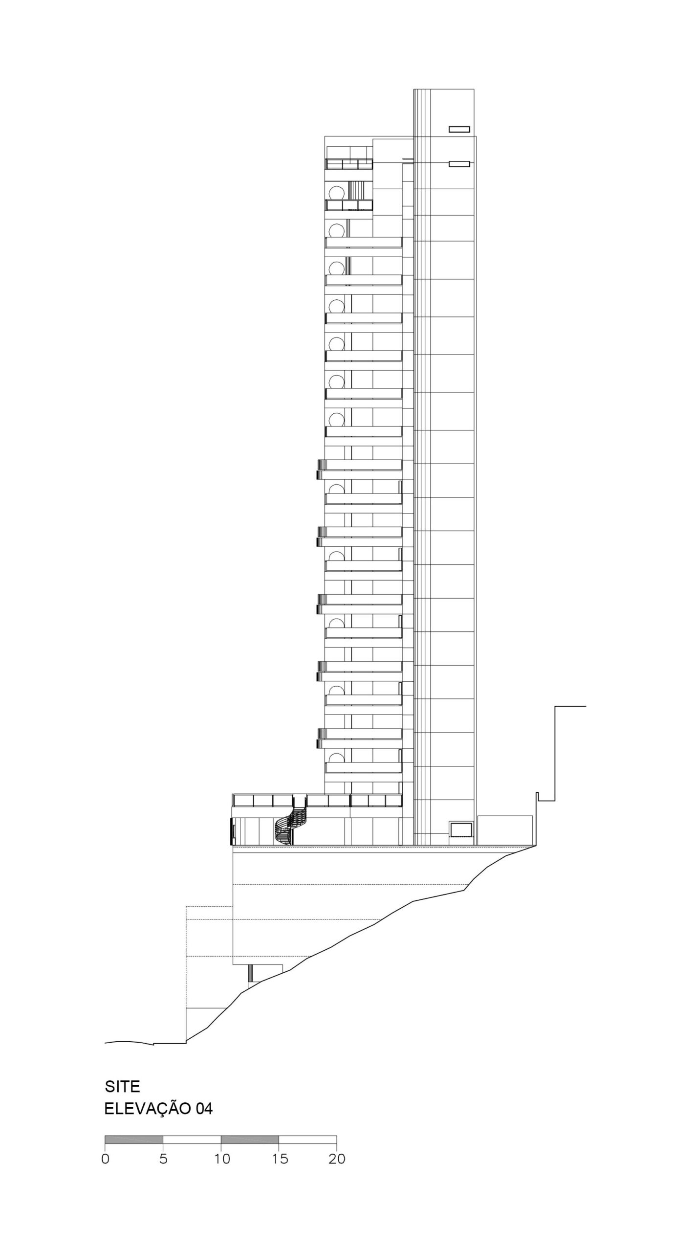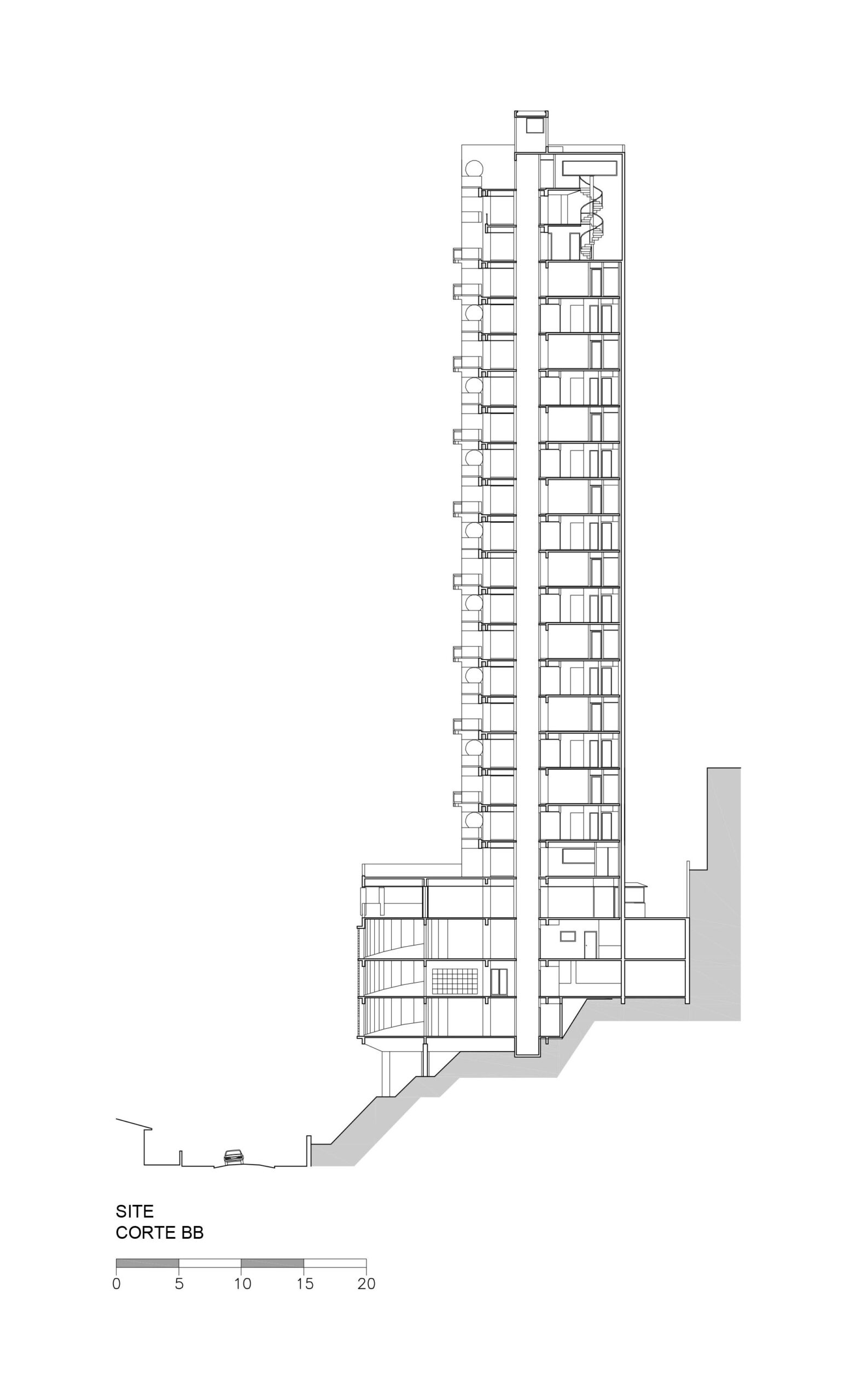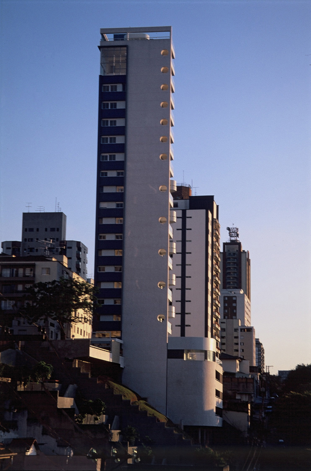 Contratados pelo arquiteto Jaime Cupertino para desenvolver o projeto deste edifício, cuja residência ocuparia os últimos pavimentos, buscamos uma solução arquitetônica que traduzisse sua proposta: unidades duplex, simplex e triplex, permitindo aproveitar ao máximo a vista privilegiada para a região noroeste de São Paulo.