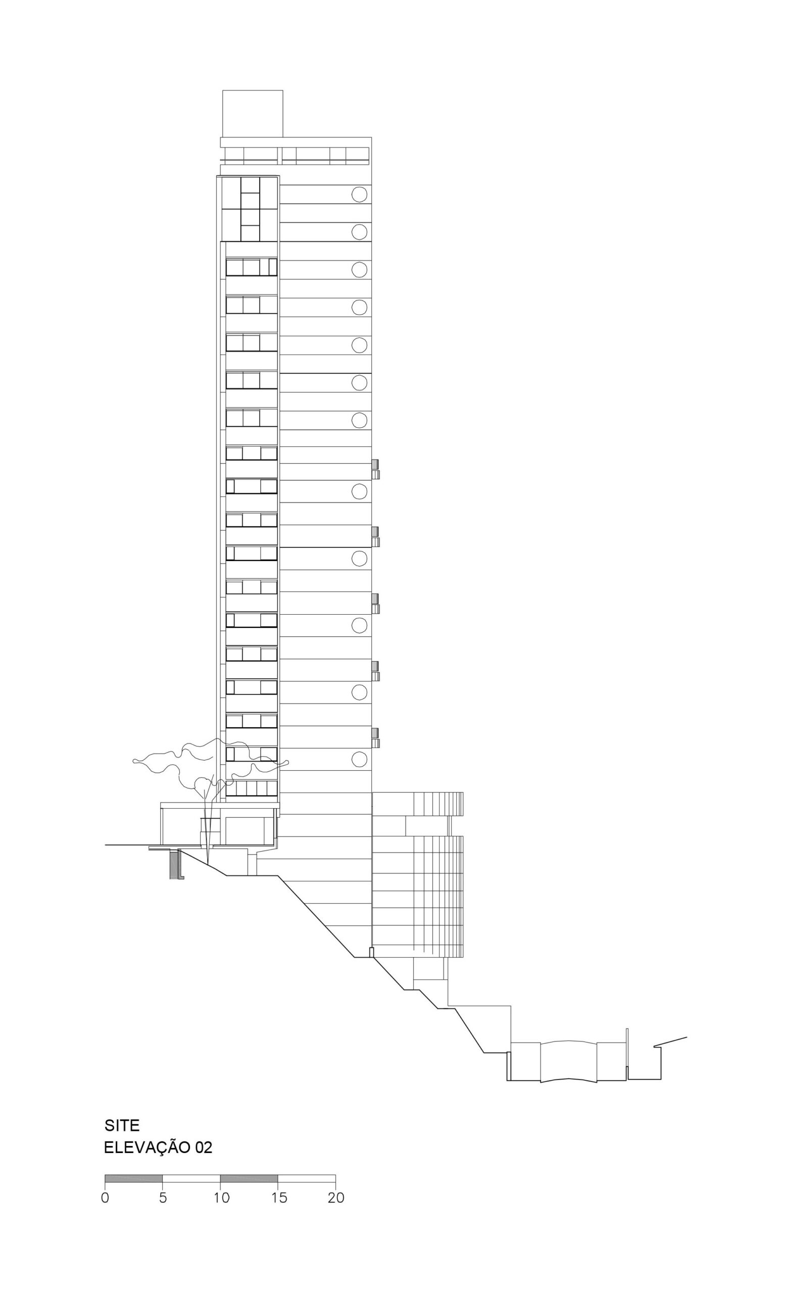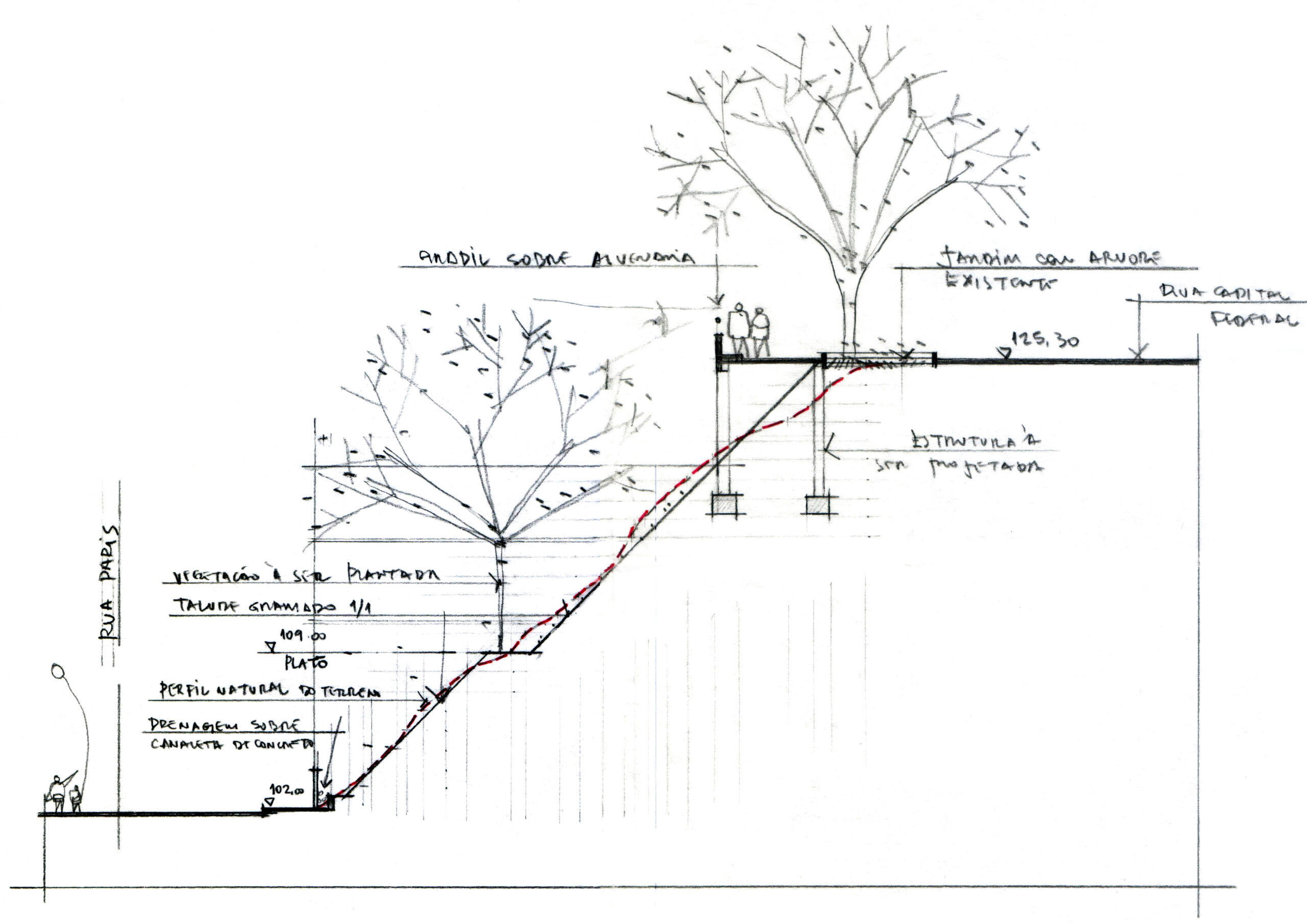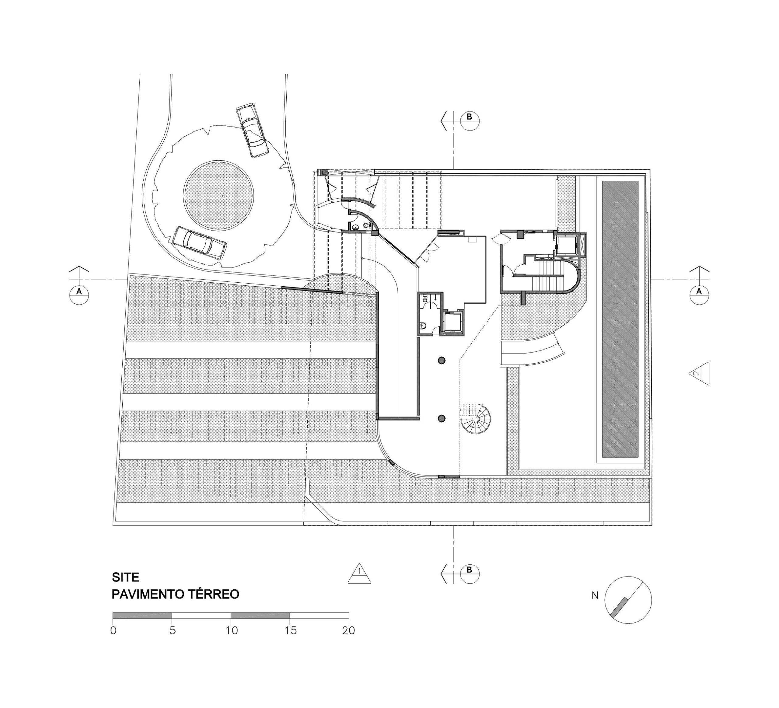 O terreno, com dimensões de 30 x 30 metros e um desnível acentuado de 30 metros, exigiu uma solução especial. Para viabilizar o acesso, foi projetada uma rotatória em torno de uma árvore existente, conciliando a preservação do elemento natural com a adequação ao desnível da rua, garantindo funcionalidade e integração ao contexto urbano.