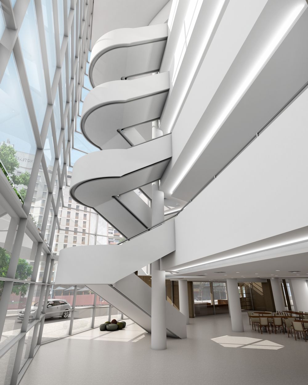 O extenso programa, aliado ao pequeno terreno disponível, foi viabilizado por meio de um edifício vertical com 12 pavimentos. A partir desse projeto arquitetônico, fomos responsáveis pelo desenvolvimento completo em padrão BIM, incluindo a coordenação e compatibilização de todos os projetos complementares.