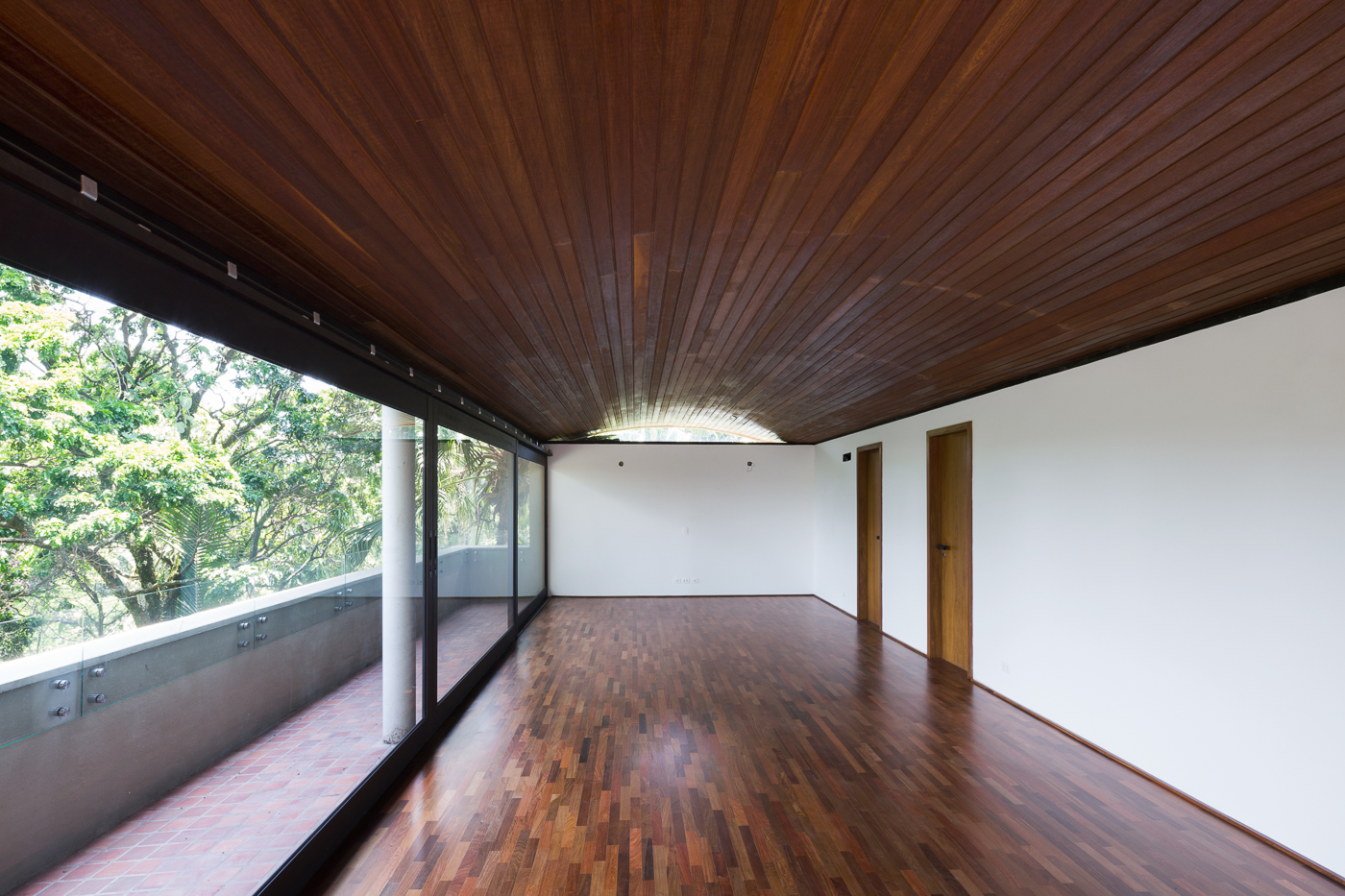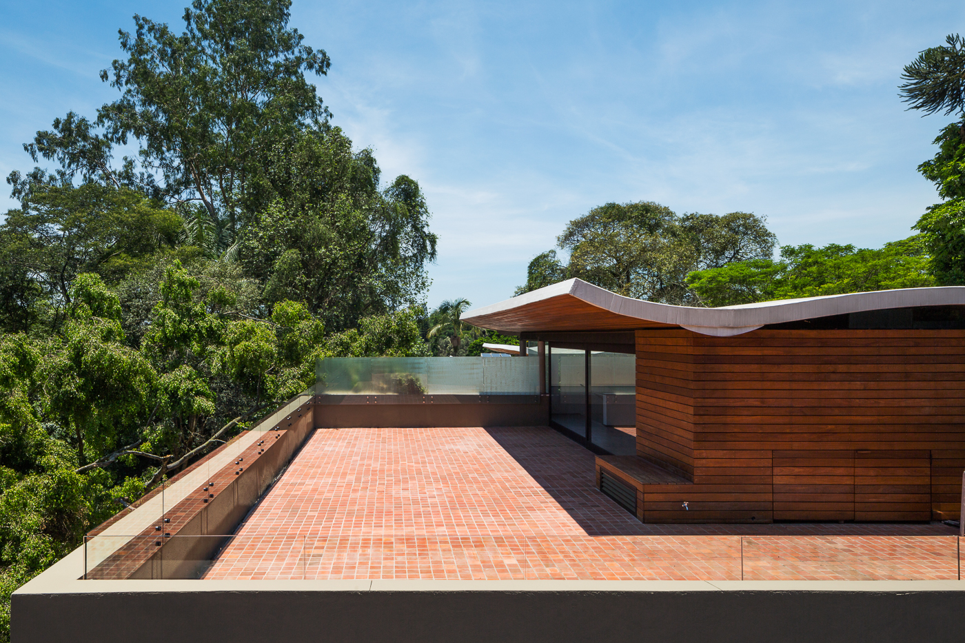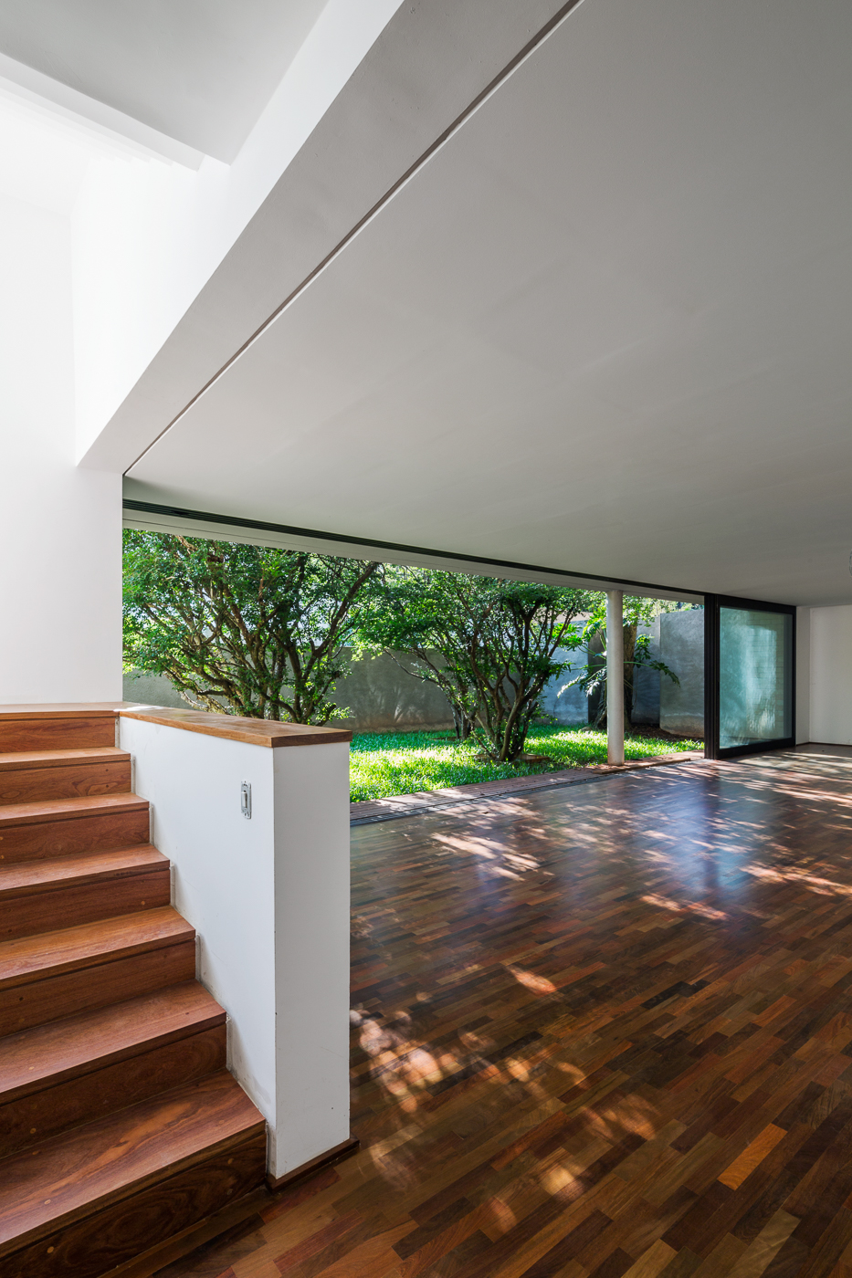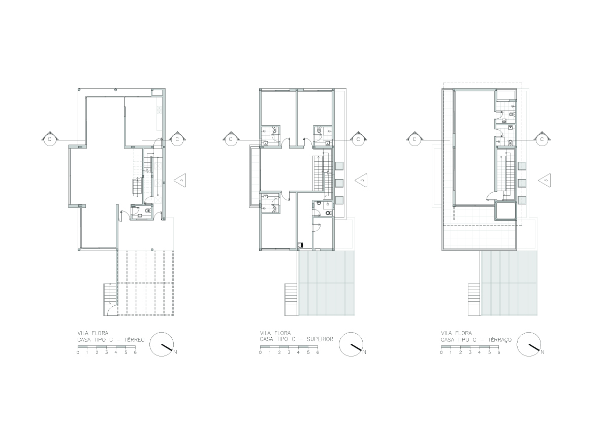 As residências foram planejadas com três configurações diferentes de planta, adequadas às condições do terreno e ao diálogo com a vegetação preservada. No térreo, as áreas sociais se integram aos jardins privativos. A escada, posicionada de forma estratégica, conecta a área íntima ao salão da cobertura, uma varanda elevada envolvida pelas copas das árvores.
