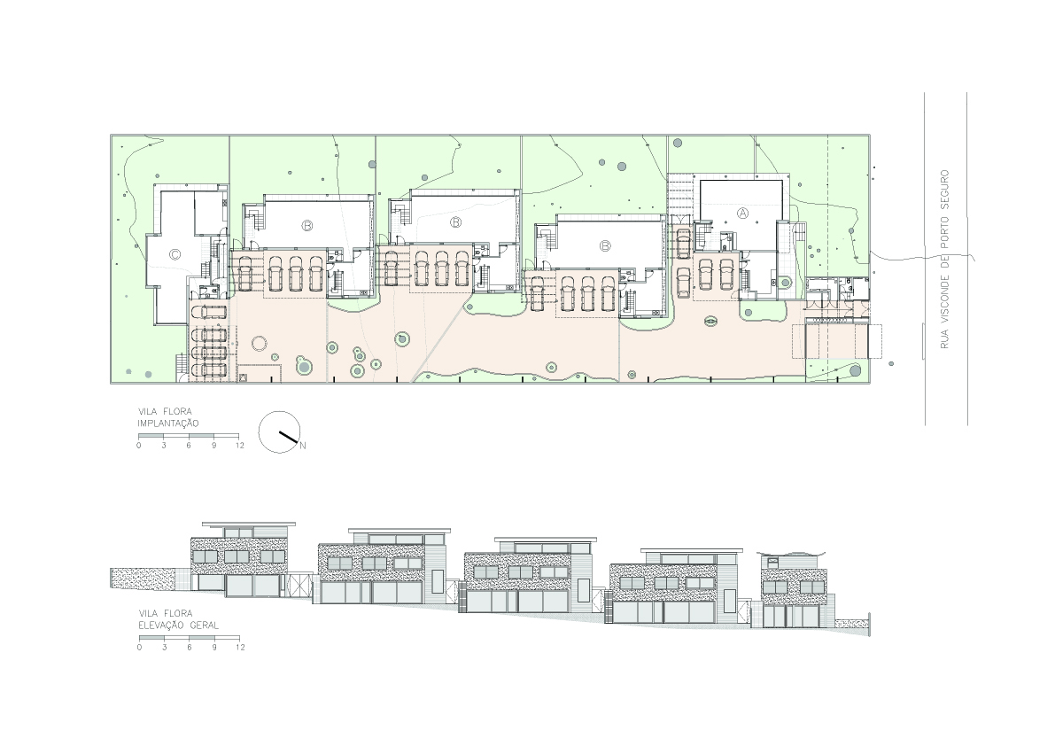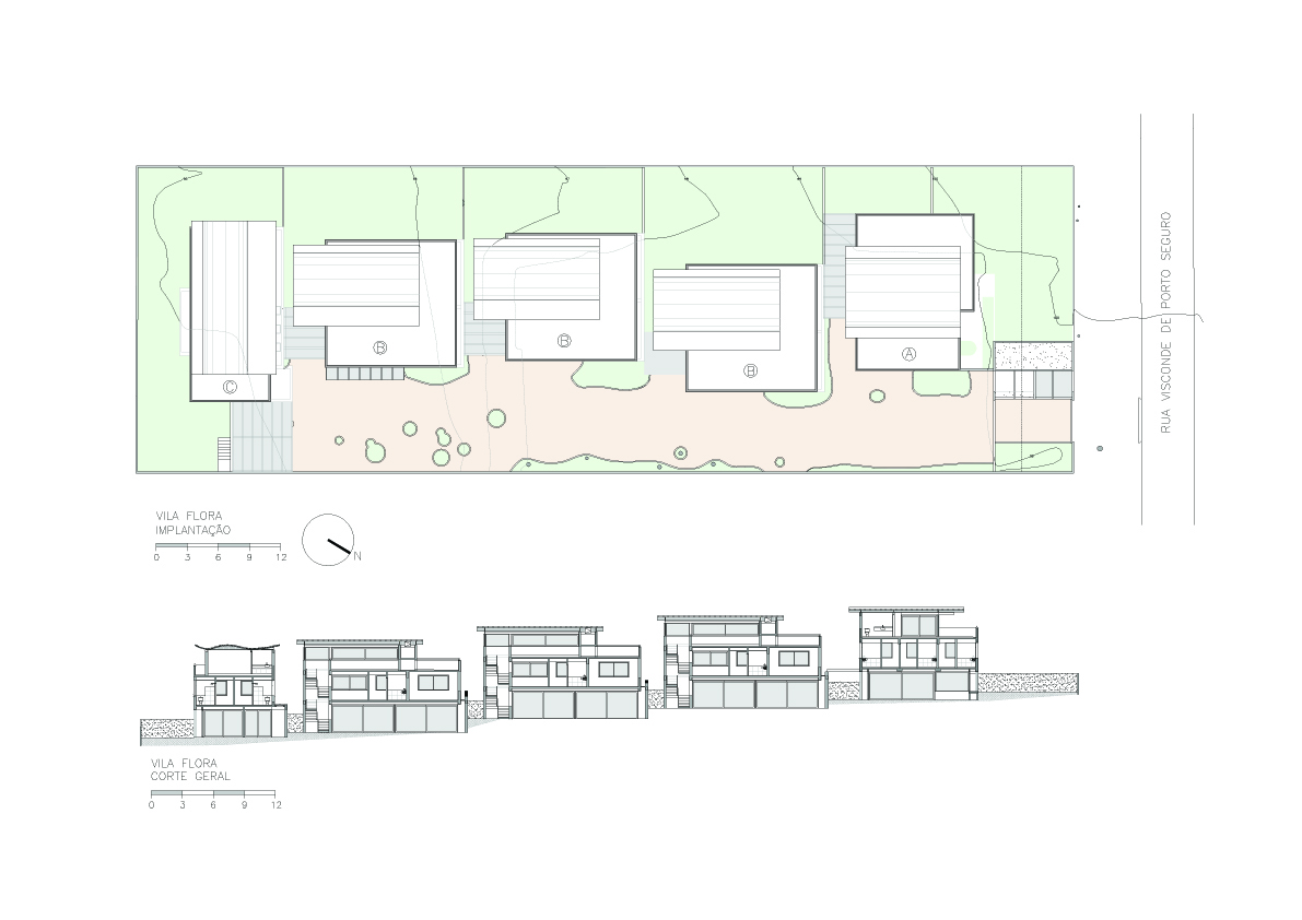 A Vila Flora é um conjunto residencial de cinco casas implantadas em um terreno densamente arborizado em São Paulo. O projeto foi conduzido pela Purarquitetura, responsável pela autoria e por etapas técnicas — do estudo preliminar ao as built — em parceria com a incorporação e construção de Fernando Schutt e Cupertino Arquitetos.